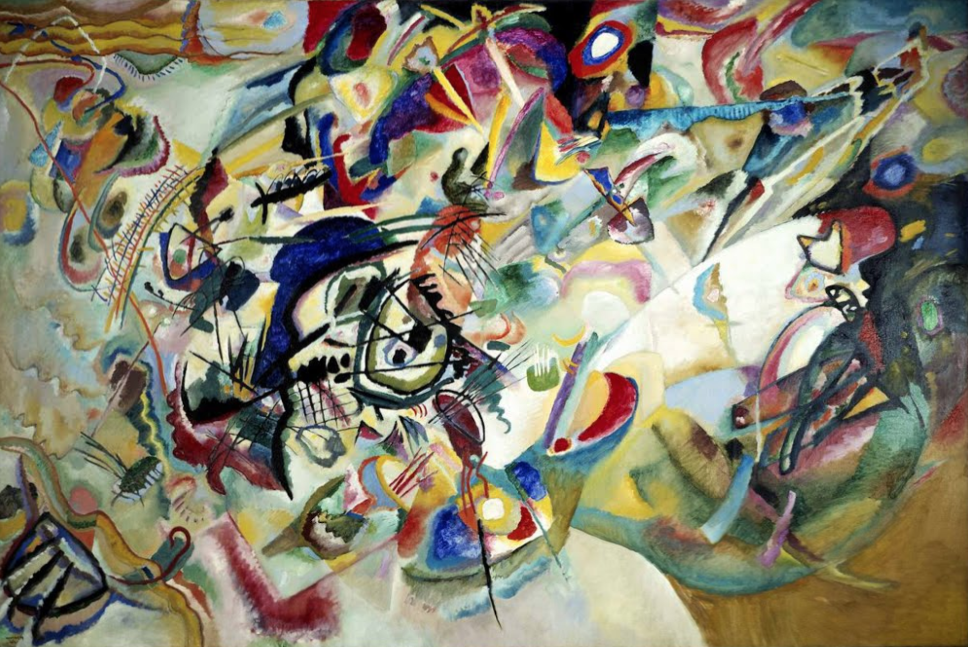 For example - if this audio makes you feel restless and disturbed - perhaps red will be the primary color for your composition with touches of yellow (Kandinsky wrote that red can be associated with restlessness, and yellow with disturbance).